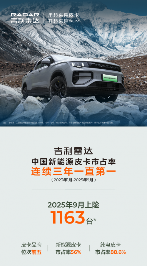 各大车企9月销量新鲜出炉。数据显示,2025年9月,吉利雷达新能源皮卡单月上险达1163台,环比增长16.3%,稳居皮卡全品类第五位,在新能源皮卡市场以56%的占有率持续领跑,更在纯电皮卡细分领域创下88.6%的市占率新高,成为传统燃油皮卡阵营中唯一稳居前列的新能源力量,有效彰显了吉利雷达在皮卡市场新能源化转型中的核心作用。